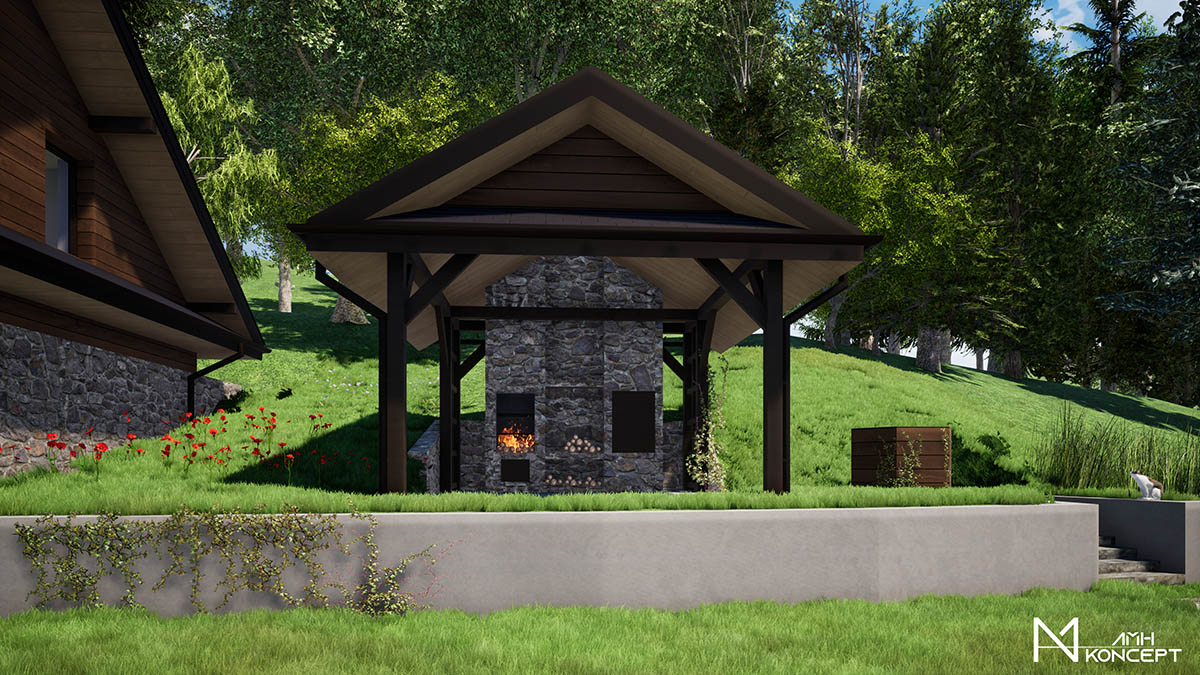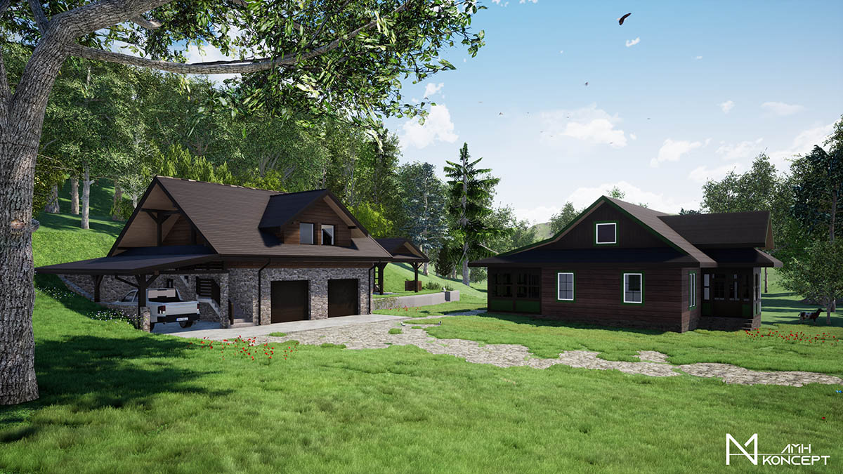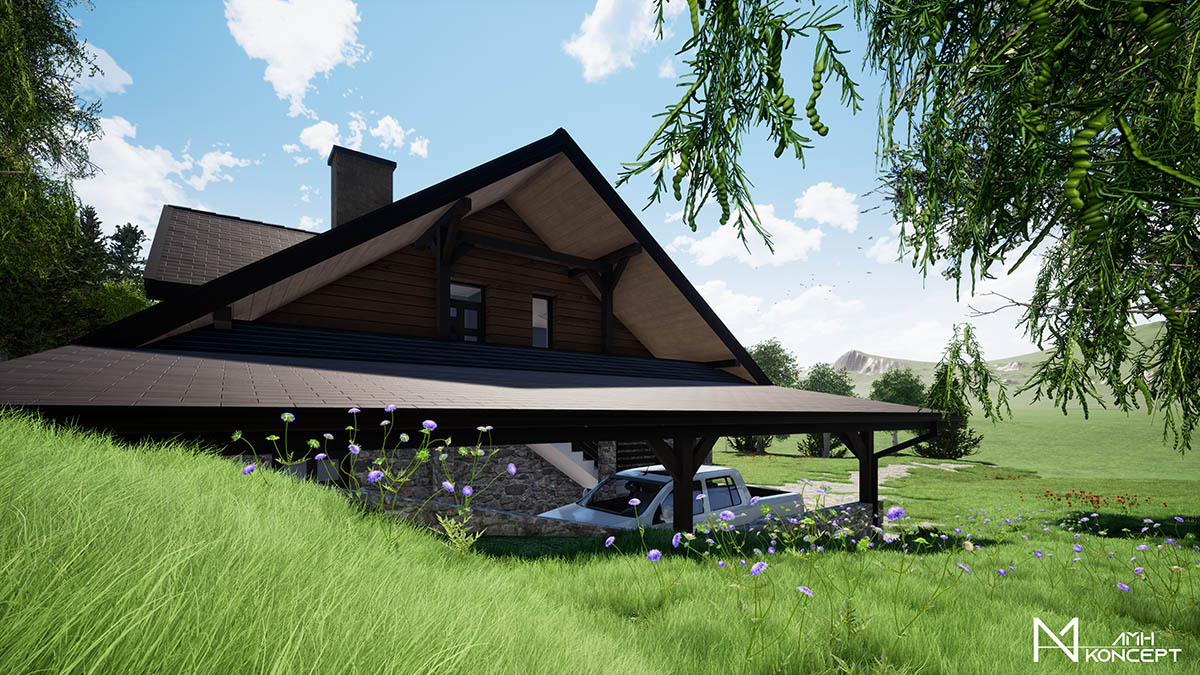 Budynek mieszkalno gospodarczy powstanie na obszernej działce i będzie wchodził w skład osady z agroturystyką. Na parterze zaprojektowano garaż dwustanowiskowy oraz kotłownię, spiżarnię i piwniczkę na wino. Na poddaszu przewidziano część mieszkalną z pokojami. Przy budynku znajdzie się również miejsce na większy samochód lub maszynę rolniczą. Nieopodal projektowanego budynku przewidziano altankę rekreacyjną z grillem i wędzarnią.